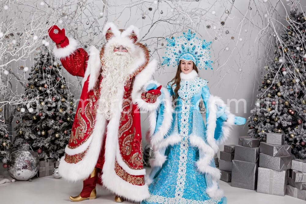 Костюм Деда Мороза состоит из двух частей. Шуба сделана из голубого материала, отстрочена белым мехом, украшена искусными узорами и вышивкой. Нижняя рубашка насыщенного синего цвета имеет декоративные красные застёжки и подпоясывается ярким красным поясом с белыми полосками. Интересно отделаны рукава: их украшают жемчужины, белые кружевные элементы и бело-красные манжеты. Довершают образ белые варежки, валенки, синяя шапка, отделанная белым мехом, посох и голубой мешок для подарков.